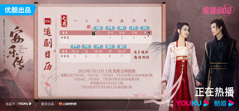 新京报讯7月15日,迪丽热巴、龚俊领衔主演的电视剧《安乐传》发布了10天追剧日历。该剧于7月12日在优酷上线,会员7月15日、7月17日、7月19日、7月21日每天18:00更新2集,7月16日、7月18日、7月20日每天18:00更新1集;非优酷会员7月13日上线,7月13日至7月21日每天18:00更新1集。