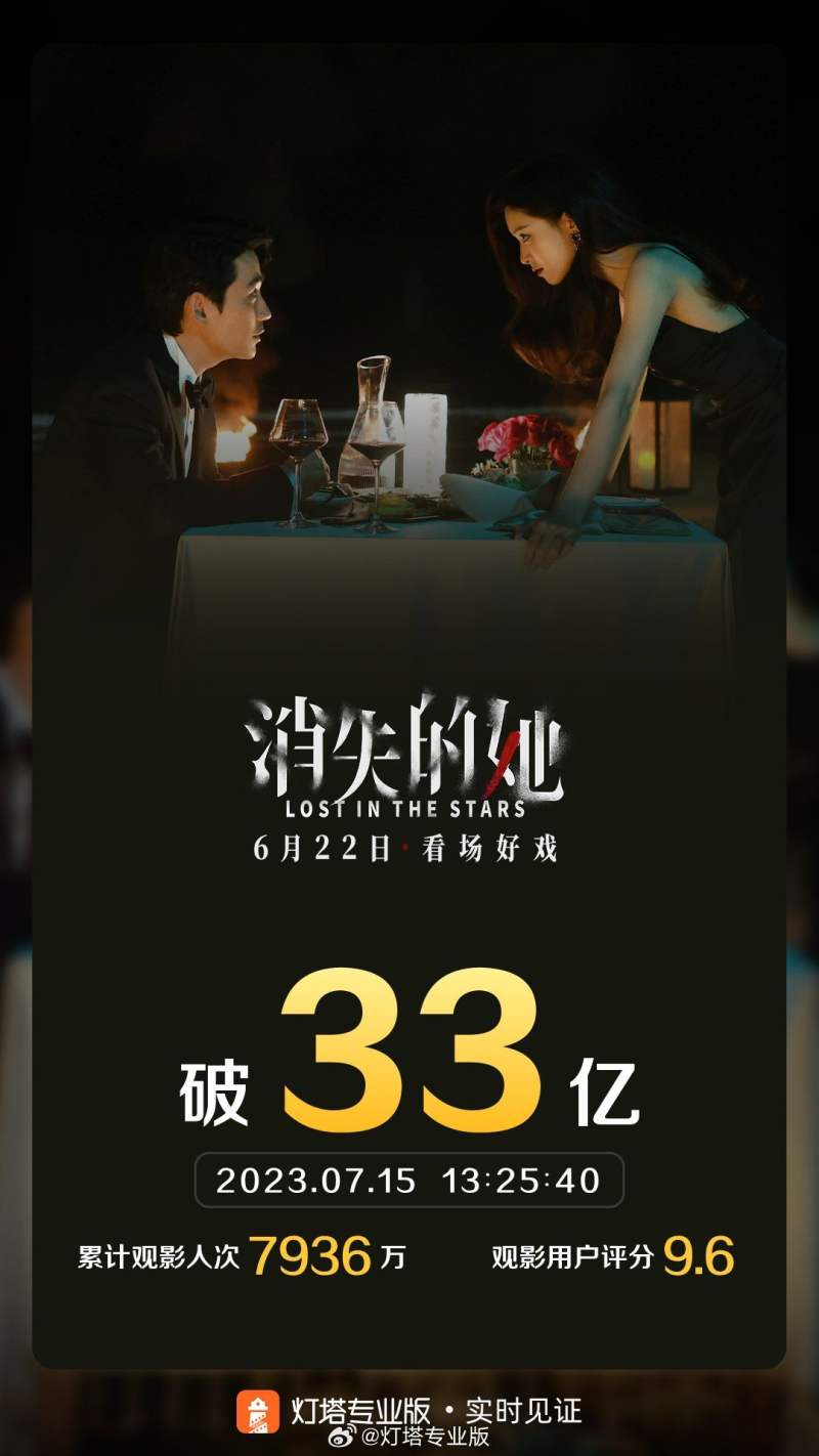 新京报讯据灯塔专业版数据显示,截至7月15日13时25分,电影《消失的她》上映24天,票房突破33亿。