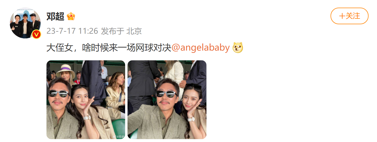 7月17日,邓超在个人微博上晒出两张与Angelababy(杨颖)的合影,并配文:大侄女,啥时候来一场网球对决?