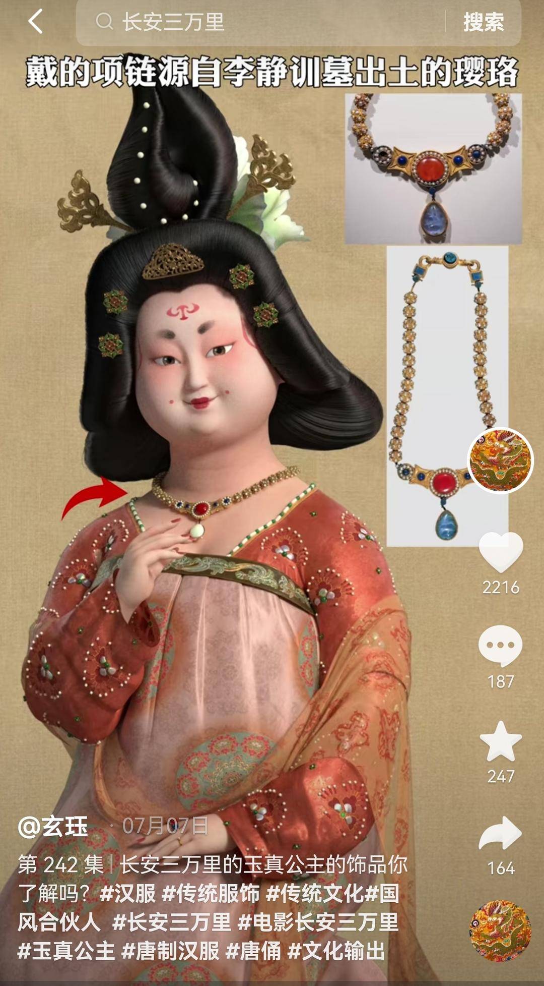玉真公主的妆造也受到汉服爱好者的追捧。比如许多网友“考古”出,玉真公主所戴的项链来自中国国家博物馆馆藏的隋嵌珍珠宝石金项链。1957年出土于陕西省西安市李静训墓。这位名叫李静训的女孩,是北周、隋代显赫的李氏家族的千金,北周宣帝与皇后杨丽华的外孙女,隋文帝杨坚与独孤皇后的曾外孙女。纯金项链上鲜红的鸡血石、宝蓝的青金石交相辉映,再配以洁白的珍珠,雍容华贵,堪称举世无双的艺术精品。此外,头饰部分出自唐李倕服装配饰。李倕,唐宗室女,是唐高祖李渊的第五代孙女。宝钗出自洛阳唐墓出土的孔雀双飞小山钗,两侧插的簪子出自唐代博鬓簪。