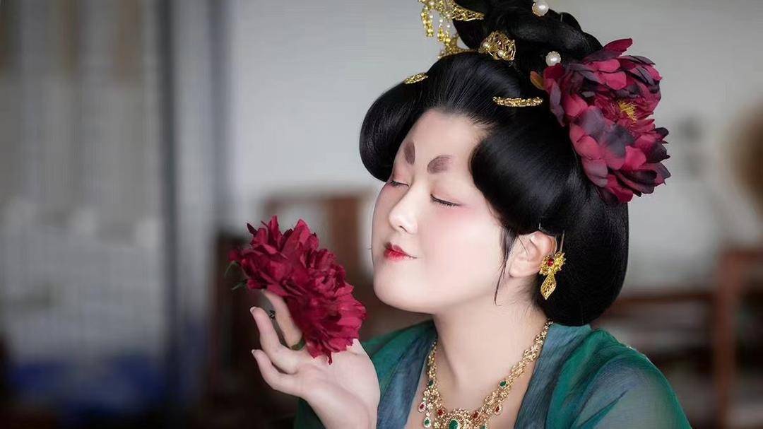“长歌”笑说,整个发髻做完,多大的脸庞都会好看。唐代整体造型与国力强盛、追求丰腴之美的审美有关,与女性的地位、经济发展都有关系。“武则天时期眉毛上扬、稍粗,贴在脸上的花钿也很大,更显自信张扬,这跟当时女性的地位较高不无关系。到杨贵妃时期又趋于温婉,脸上贴金钿,与宋代雅致截然不同。”