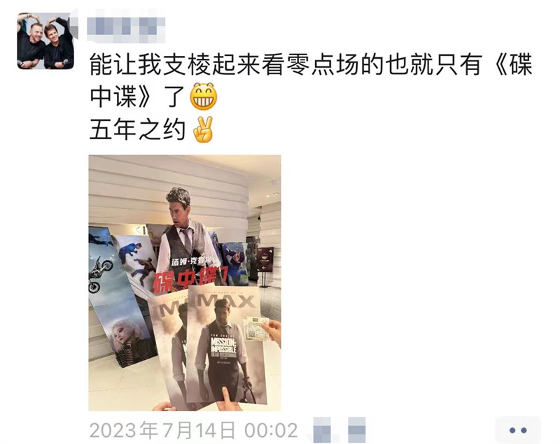 7月14日《碟中谍7》上映,当天零点,影迷小马准时来到了影院打卡,奔赴她和“碟中谍”的5年之约,她在朋友圈写道:“能让我支棱起来看零点场的也只有《碟中谍》了。”
