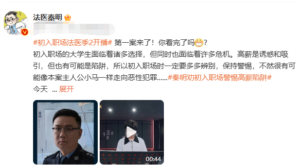 “第一案来了!你看完了吗?”随着职场奋斗纪实真人秀《初入职场·法医季2》的播出,著名作家、法医秦明更新了自己的微博,作为节目考核助力团成员,他提醒道:“初入职场的大学生面临着诸多选择,但同时也面临着许多危机。高薪是诱惑和吸引,但也有可能是陷阱,所以初入职场时一定要多多辨别,保持警惕,不然很有可能像本案主人公小马一样走向恶性犯罪。”