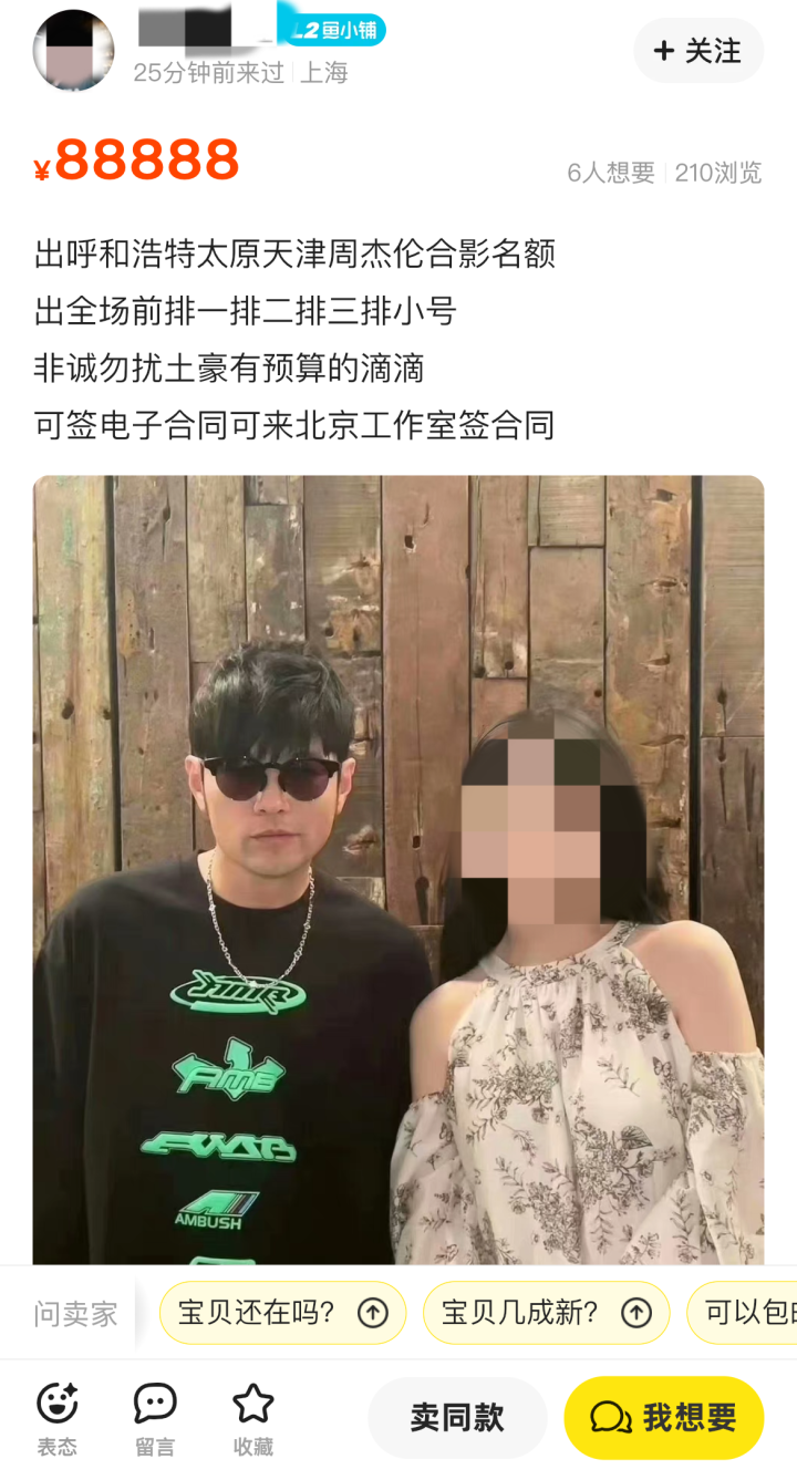 继15万一张的天价演唱会门票时间后,日前,又有网友发现在二手交易平台上,居然出现了开价88888元售卖所谓的和周杰伦合照的名额。记者向几位在闲鱼平台上售卖合影资格的卖家咨询后得知,大部分卖家都声称自己有内部渠道,可以安排绝大多数演出场次的合影,有多人合照、单人合照等多种规格,报价在1-8万元不等。而当问及合影流程时,他们大多无法给到一个清晰的答复,要么建议记者添加其微信后进一步沟通,要么就不再回复了。