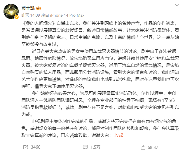 对此,该剧总制片人贾士凯专门发博回应称,剧中的灭火器是男主角宋焰自费购买的私人用品,而非挪用公共消防设施。不过,这一回应网友似乎并不买账,甚至有网友提出质疑:“自费购买就能随意玩耍?”