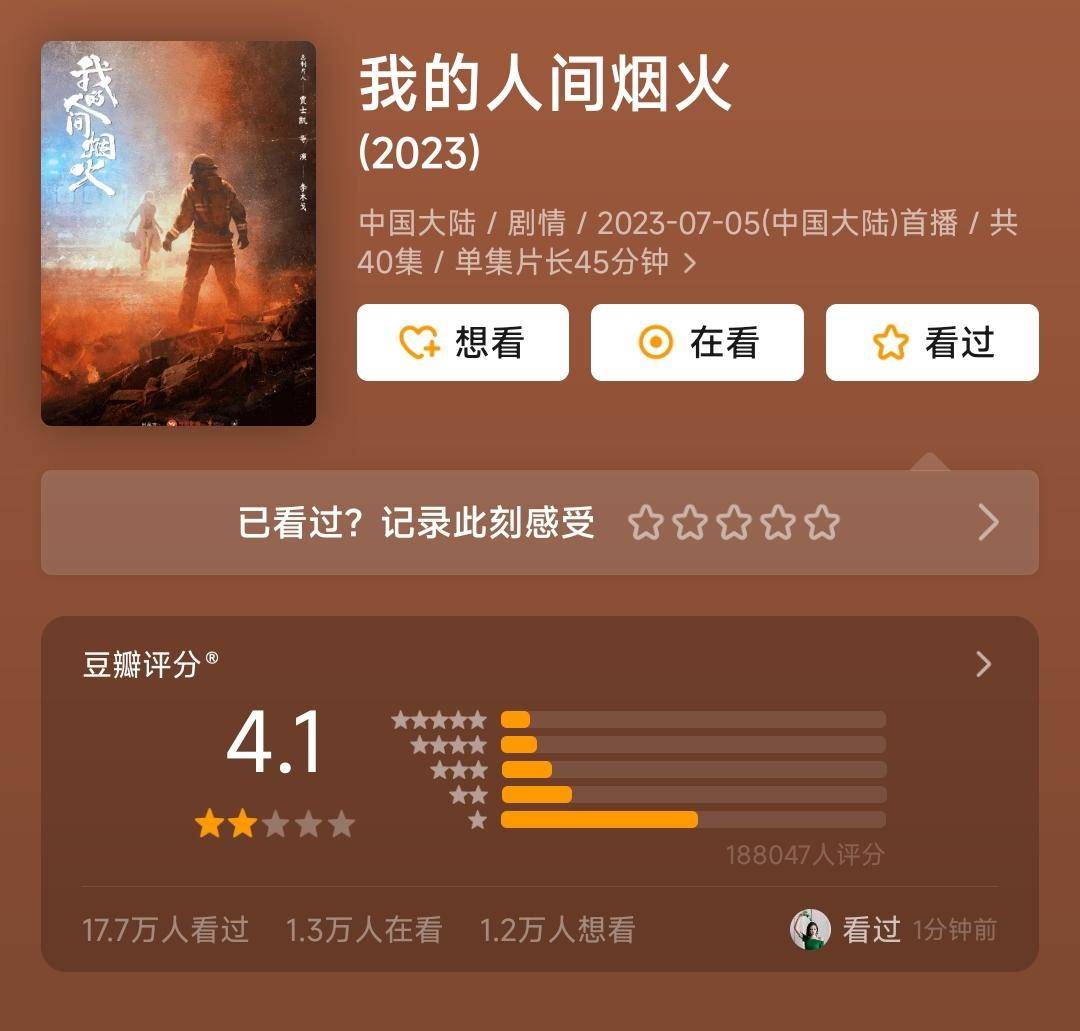 剧播完了,由杨洋、王楚然等演员参演的影视剧《我的人间烟火》引发的争议,仍在持续蔓延。7月23日,该剧在豆瓣平台开分,18万观众聚集在一起,共同打出了4.1的超低分,即便这样,还有人在评论区喊着“高了高了”“这剧超过2分,在座的各位都有责任”……