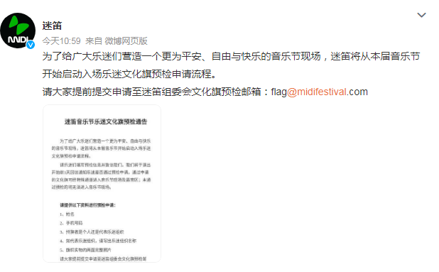 7月26日,国内知名音乐节品牌迷笛发布了《迷笛音乐节乐迷文化旗预检通告》,表示为了给广大乐迷们营造一个更为平安、自由与快乐的音乐节现场,迷笛将从本届音乐节开启入场乐迷文化旗预检申请流程。要携带文化旗入场的乐迷们需填写预检信息致信迷笛官方,迷笛方将在演出开始前1天回信乐迷是否通过预检申请,通过申请的文化旗可以经特殊通道进入音乐节现场及露营区。