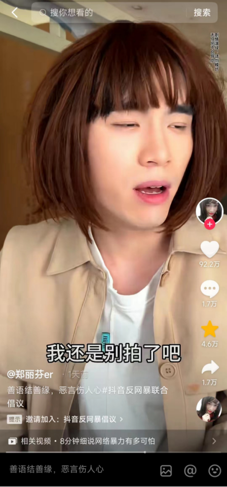 抖音达人@郑丽芬er凭借男扮女装,幽默复刻现实生活吸引了超过1470万粉丝关注。在反网暴视频中,他饰演多重身份,还原多个被网暴的经典场景,如被喷“丑”“身材差”,老年人被黑“为老不尊”等,最终受害者都放弃了交流,发人深省。他在视频中呼吁,别让一句话、一条评论毁掉一个人,倡导网友在网络上留下友善。该条视频点赞量突破了92万,无数网友看后深表认同,表示“为什么有些人的恶意这么大”“网络喷子最没品”“说话做事一定要建立在善良的基础上”。