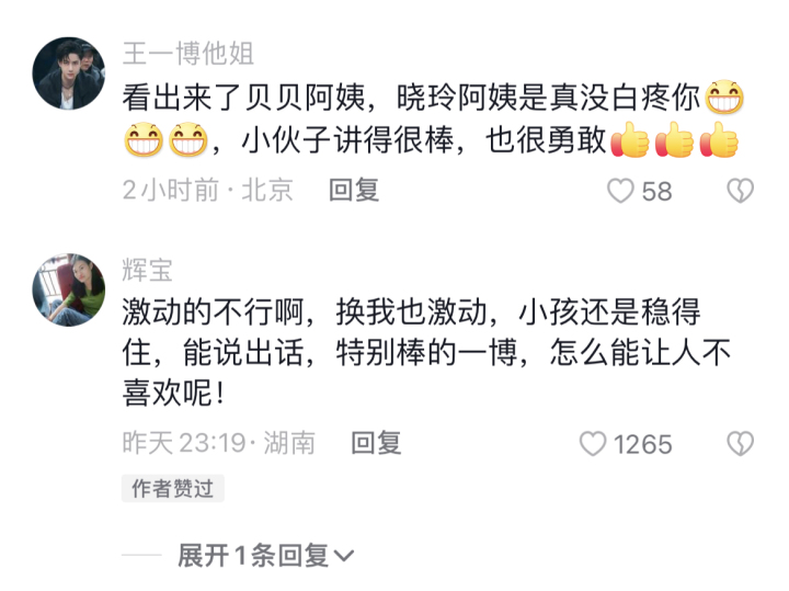 “我还想跟王一博哥哥说一句话,我还有我小姨、我的妈妈,还有我的贝贝阿姨,晓玲阿姨,都特别喜欢你。我们会一直支持你。”