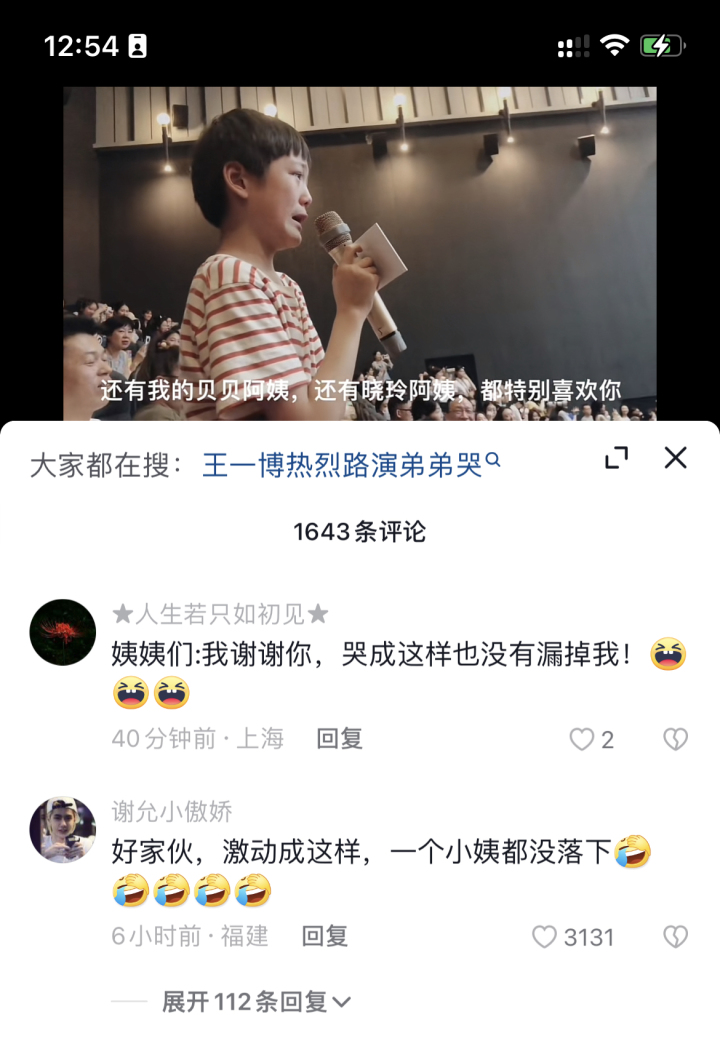 短片中的小男孩,在这场路演的映后,流着热泪,不紧不慢地替家里的女性长辈一一向《热烈》主演王一博表白。