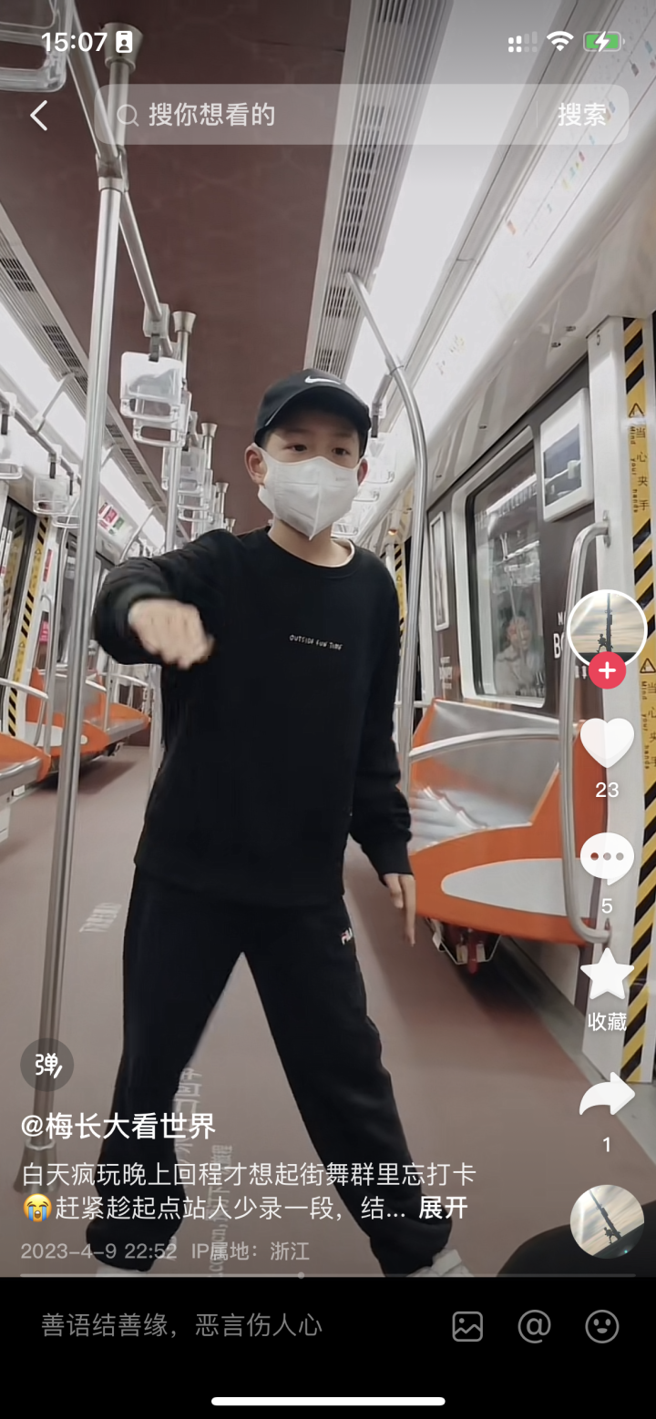 除了看电影,一未还有着6年的街舞舞龄,在一未妈妈的抖音账号中还有他在地铁上跳popping(震动舞)的视频。