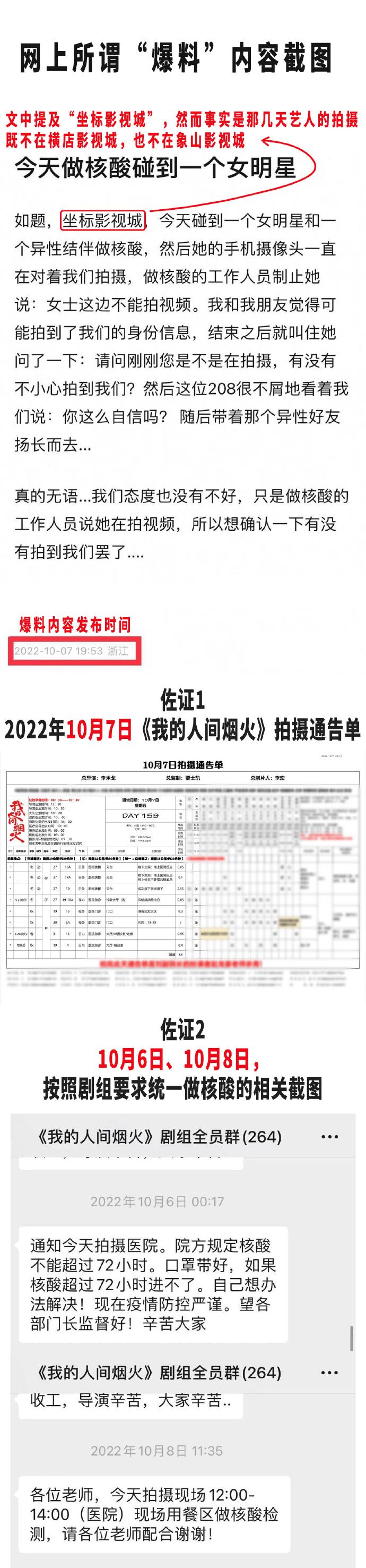 网传“王楚然做核酸耍大牌”的爆料发生在2022年10月7日,当时王楚然正在剧组进行拍摄,全天没有做核酸,与网友爆料“核酸事件”的地点“影视城”完全不同(不管是横店影视城还是象山影视城,距离剧组拍摄地都有很长的路程)。当时剧组全程统一做核酸,王楚然于10月6日和10月8日均按剧组要求完成了核酸检测,符合当地的48小时核酸规定,事件中的当事人并非王楚然。