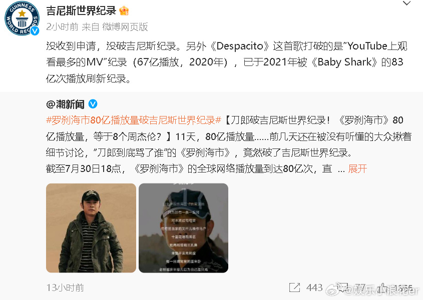 对此,吉尼斯世界纪录的官方微博在今天辟谣称:没收到申请,没破吉尼斯纪录。另据吉尼斯世界纪录官方介绍,《Despacito》这首歌打破的是“YouTube上观看最多的MV”纪录(67亿播放,2020年),已于2021年被《Baby Shark》的83亿次播放刷新纪录。