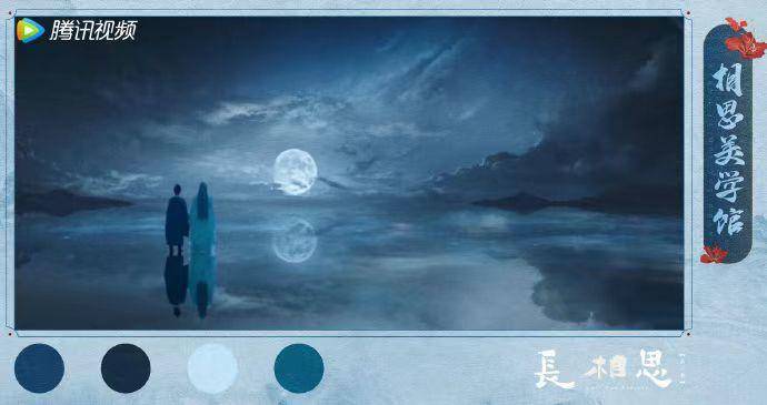 《长相思第一季》打造了“长相思式”独特古装风格的色彩美学。如大荒以黄棕色调为主的,柔和、低调,银色的明月、深蓝幽暗开阔的海面、深绿白色交错的雾霭山脉、苍凉空旷的环境氛围一目了然。