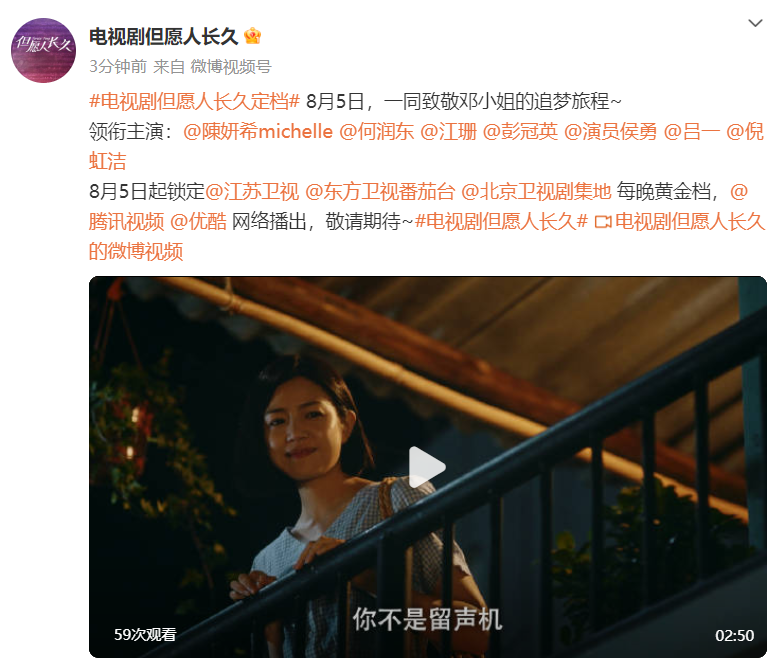 8月4日,据电视剧《但愿人长久》微博:电视剧但愿人长久定档。8月5日,一同致敬邓小姐的追梦旅程~