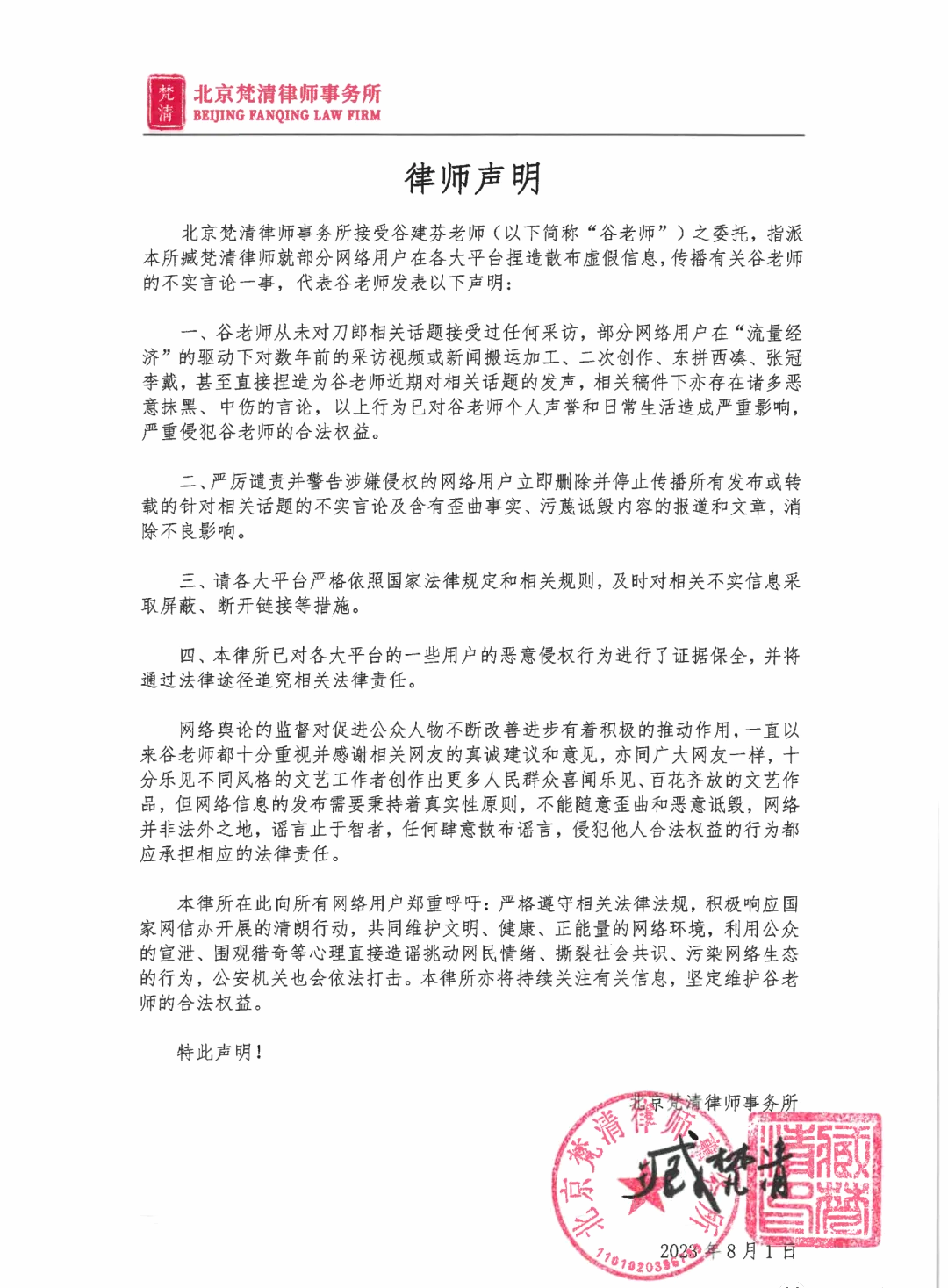 对此,谷建芬委托北京梵清律师事务所就网络上出现的不实言论发表声明。文中称,谷老师从未对刀郎相关话题接受过任何采访,部分网络用户在流量经济的驱动下对数年前的采访视频或新闻搬运加工、二次创作、东拼西凑、张冠李戴,甚至直接捏造为谷老师近期对相关话题的发声,相关稿件下亦存在诸多恶意抹黑、中伤的言论,以上行为已对谷老师个人声誉和日常生活造成严重影响,严重侵犯谷老师的合法权益。