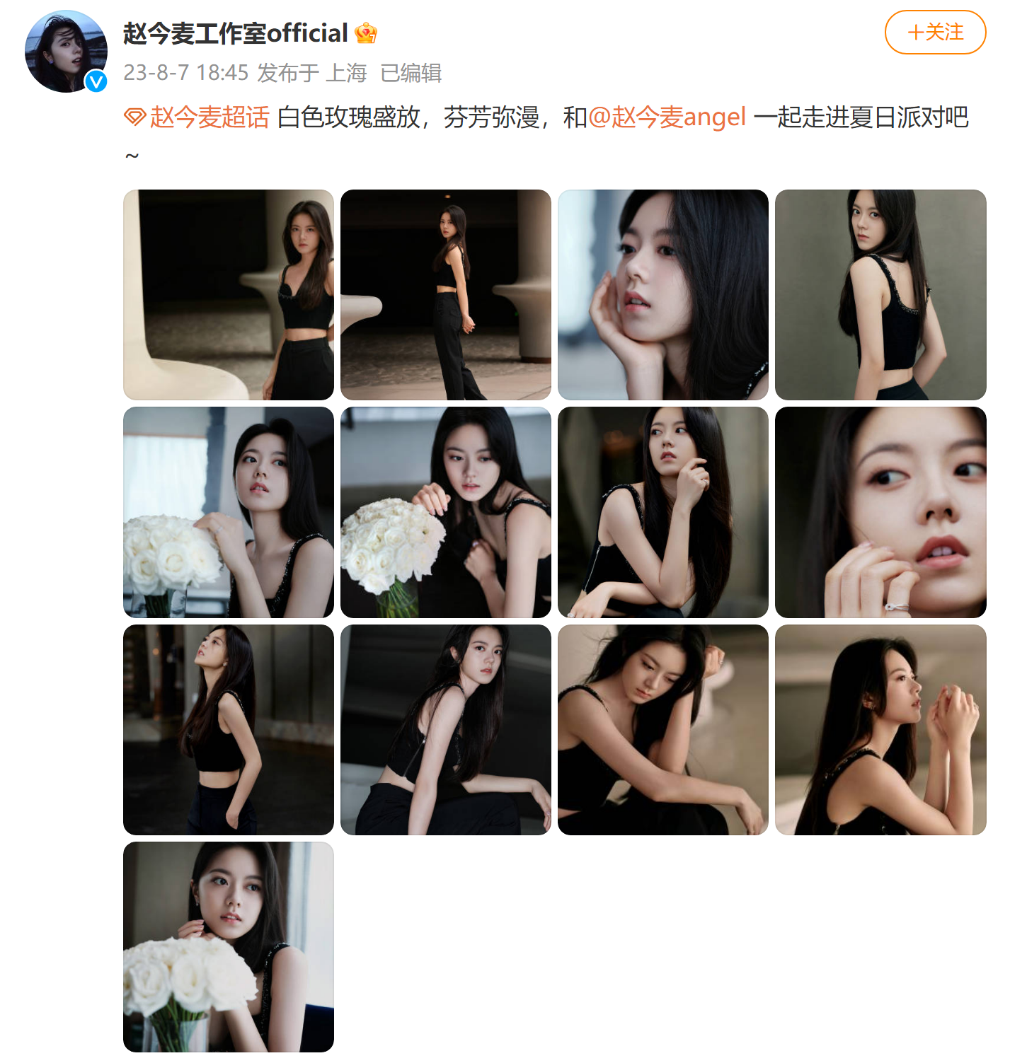 8月7日,赵今麦工作室发布演员赵今麦黑色吊带配裤装新造型,并配文:白色玫瑰盛放,芬芳弥漫,和赵今麦一起走进夏日派对吧~
