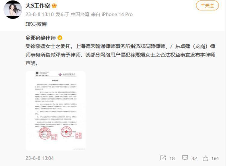 8月8日,大S(徐熙媛)工作室通过律师发声明,称张兰、汪小菲在网络平台对大S实施侮辱、诽谤等行为,大S已于2月16日起诉,北京互联网法院4月20日立案。针对其他部分网络用户的侵权行为,大S已委托律师完成取证工作,呼吁大家理性发言。