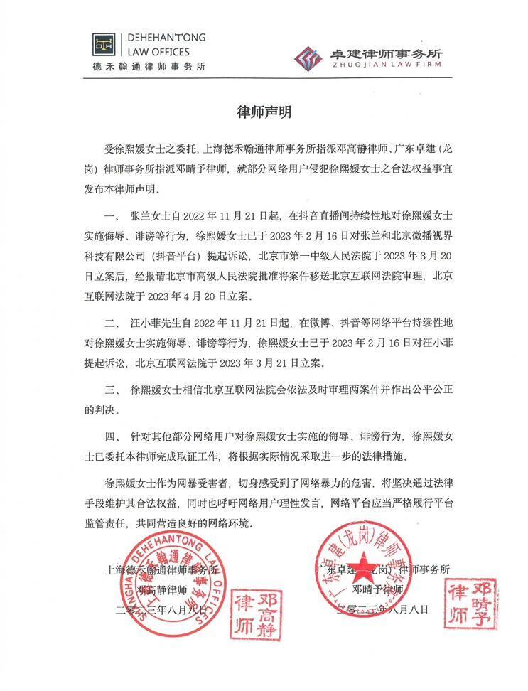 声明中还表示,徐熙媛女士作为网暴受害者,切身感受到了网络暴力的危害,将坚决通过法律手段维护其合法权益,同时也呼吁网络用户理性发言,网络平台应当严格履行平台监管责任,共同营造良好的网络环境。