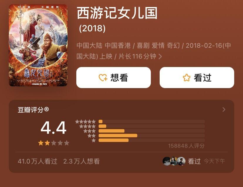 当然,并非所有的影片都能凭点映成功。比如《西游记女儿国》已经成为“点映死”的经典案例,该片虽然点映首日票房高达1.7亿元,但上映后口碑不理想,豆瓣评分仅有4.4分,最终票房定格在7.2亿元。