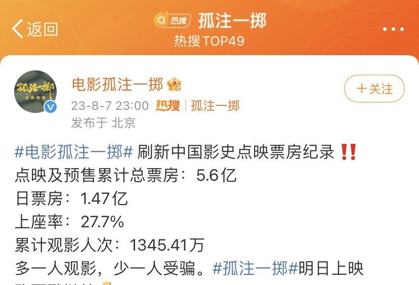 “上周末。我们删了一场《巨齿鲨2》,这个影厅有三百多个座位,临时改成了《孤注一掷》。”一位影城经理表示,完全没有想到《孤注一掷》票房这么火爆。他说,此次电影出品和发行方想利用点映扩散口碑和热度,发现效果不错,而同档期的《热烈》《巨齿鲨2》后劲不足,所以后来《孤注一掷》直接提档抢占票房。
