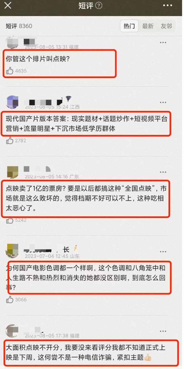 与此同时,电影正式上映前的“点映”形式也引起舆论质疑:点映期间排片超过20%,大规模点映堪比提前上映,破坏了以往的点映规则;在时间宝贵的暑期档,挤压了同期上映影片的空间;点映期间豆瓣等平台不开分,观众无法了解影片真实口碑……《孤注一掷》点映引发的一系列争议,有网友认为是“钻行业漏洞”“不讲武德”,也有网友表示,这是市场行为,公平竞争,是为了迎合观众的选择。