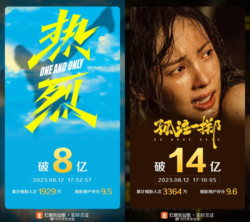 电影《热烈》票房突破8亿,《孤注一掷》票房破14亿。图片来自灯塔专业版
