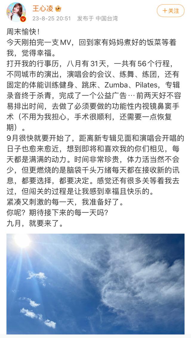 直到忙到前两天王心凌才好不容易排出时间,去做了必须要做的功能性内视镜鼻窦手术,并报平安:“不用为我担心,手术很顺利,还需要一点恢复期”。而面对同样充实的九月,王心凌表示自己准备好了。