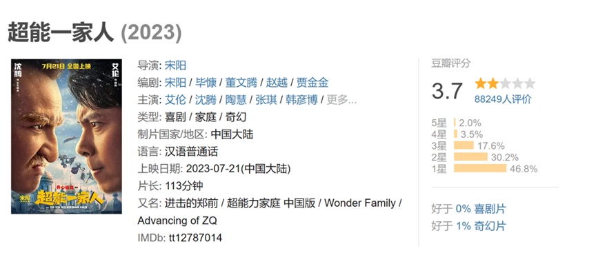 曾一度高居“暑期想看榜”榜首的《超能一家人》,上映后反响平平,被批人物复杂,剧情拖沓,豆瓣评分一路跌至3.7分,未能复现《夏洛特烦恼》、《西虹市首富》的火爆。