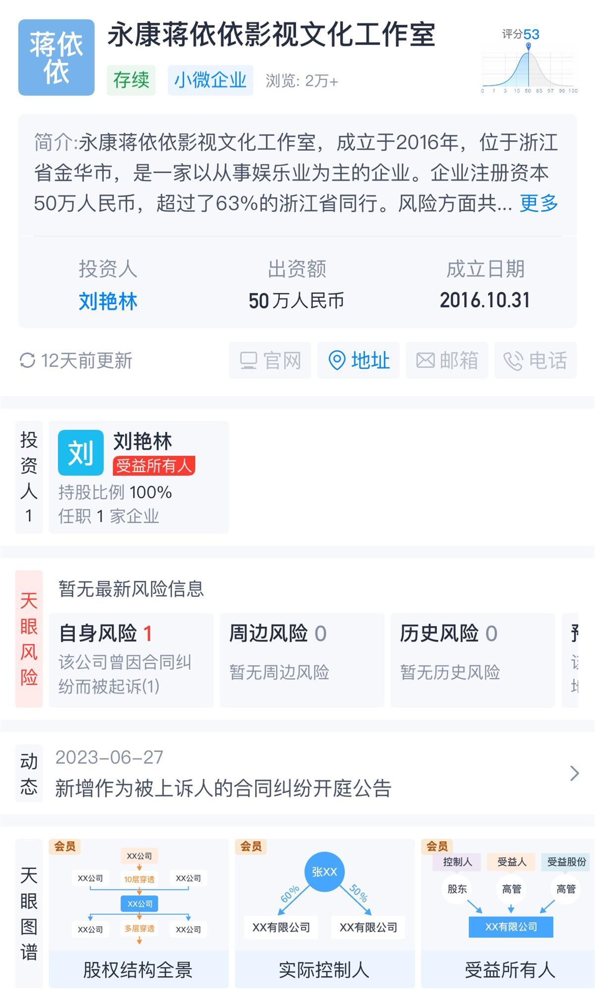 极目新闻记者登录天眼查app发现,目前,永康蒋依依影视文化工作室经营状态依然为“存续”状态,其注册资本为50万人民币,投资人、受益人均为刘艳林。