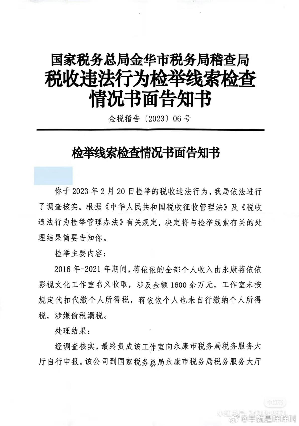 9月3日16:58,署名为“LHHHH”的小红书网友发布消息提到,自己于2023年2月实名向税务局举报演员蒋依依偷税漏税问题,并于(今年)7月收到稽查局检查告知书。