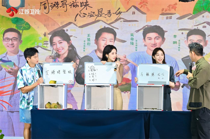 活动现场气氛热烈,笑声不断,节目组策划了一轮以洪泽湖特色食材为题目的“食材盲盒游戏互动挑战”,螃蟹、龙虾、鳝鱼、螺狮、芡实五个特色物产被装入盲盒之中,嘉宾通过触摸食材猜出是什么物产。吴奇隆率先下手试探,献上影帝级表演,将紧张氛围拉满;姜妍对盲盒里的食材都是满满好奇,还贡献了不少“表情包”,引发现场爆笑连连。最终,只有吴奇隆一人猜中全部答案。