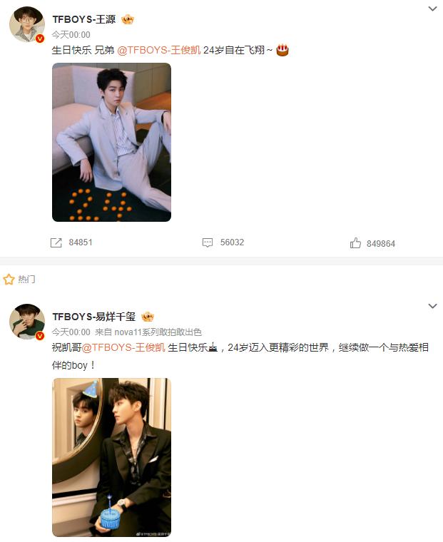王源亲切称呼他为兄弟,祝福他在24岁自在飞翔。易烊千玺则叫他凯哥,希望24岁的他迈入更精彩的世界,继续做一个与热爱相伴的boy!