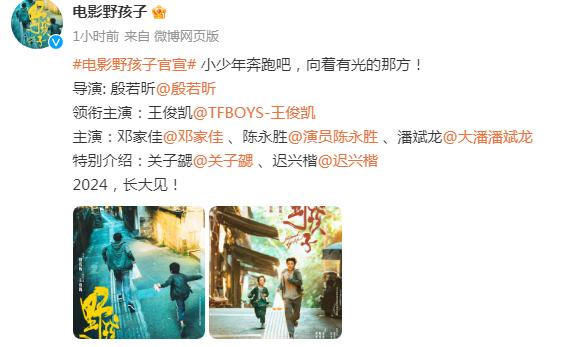 今(21)日,电影《野孩子》官宣阵容,并配文:“2024,长大见 ”。该片由殷若昕执导,王俊凯、邓家佳、陈永胜、潘斌龙等主演。