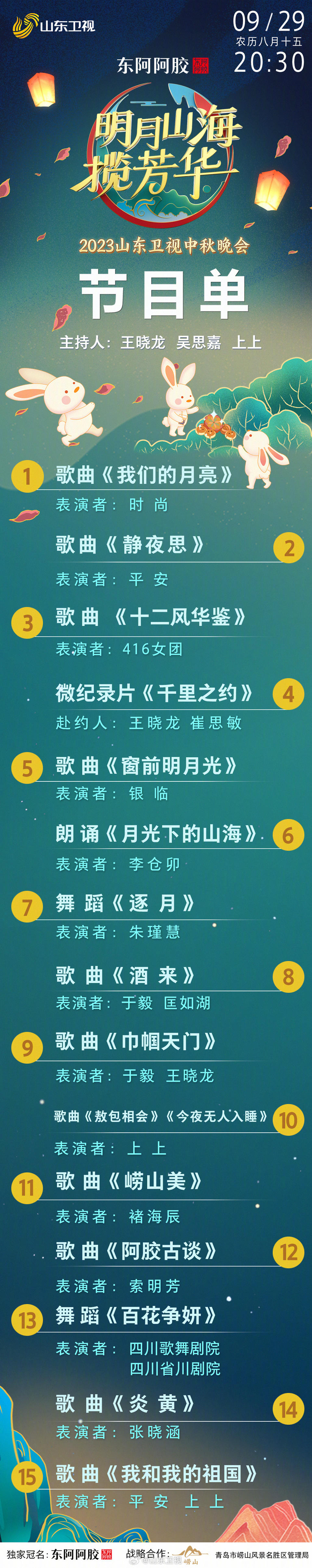 晚会以“明月山海揽芳华”为主题,以当下流行的“国潮+”为主要创作理念,由致明月、致美好、致未来三个篇章组成,北京大学博士生上上和山东卫视主持人王晓龙、吴思嘉共同担纲主持。于毅、平安、上上、褚海辰、416女团、银临、索明芳、张晓涵、李仓卯、时尚等嘉宾将带来歌舞、诵读、戏曲等多种艺术化表达,实现多元文化的融合碰撞,讲述新时代的美好生活,描绘中秋佳节“海上生明月,天涯共此时”的美好意境。