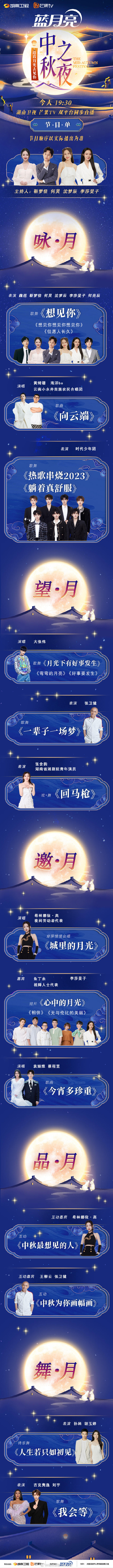 本次晚会有何炅、沈梦辰、靳梦佳、李莎旻子、张卫健、张含韵、袁娅维、鱼丁糸、希林娜依·高、魏巡、孙科、时代少年团、刘宇、吉克隽逸、黄绮珊、胡玉婷、何亮辰、大张伟、蔡程昱温暖加盟,送上中秋惊喜。