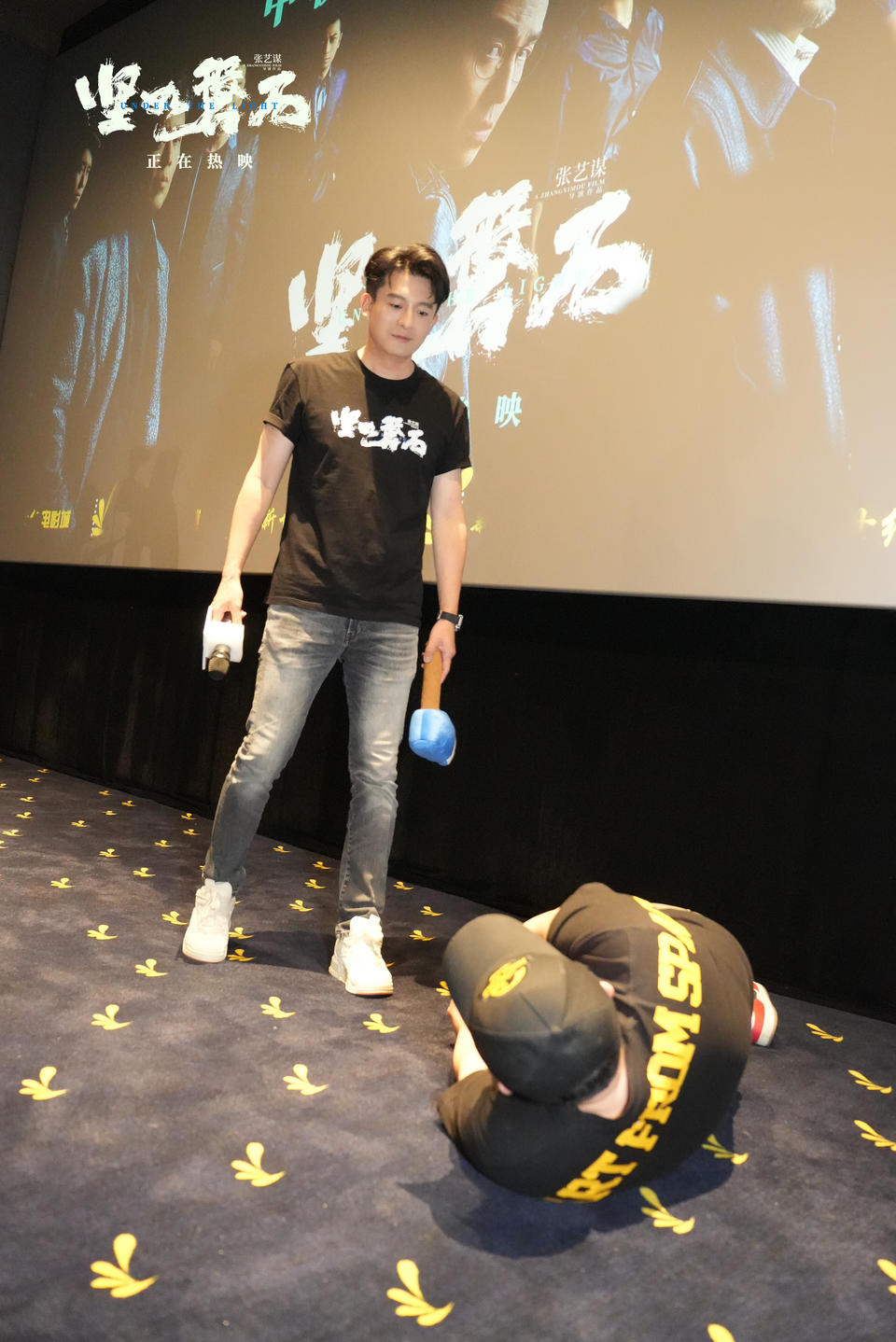 此外,还有观众给孙艺洲送上了头盔,来保护David被片中黎志田砸坏的脑袋。孙艺洲更是现场自愿“认罪服法”,站到观众席前让大家敲一敲自己顶着头盔的脑袋,开玩笑道,“不要把对David的仇恨全部放在我的头上”。
