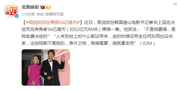 近日,周润发在韩国釜山电影节记者会上回应决定死后将身家56亿港币(约52亿元RMB)裸捐一事。他笑说:“不是我要捐,是我老婆决定的”“人来到世上时什么都没带来,走的时候没带走任何东西也没关系,这些钱都不是我的,身外之物,有谁需要,谁就拿走吧。”