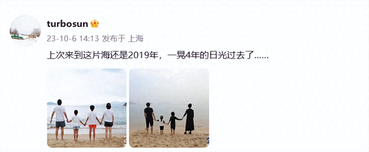 只见第一张照片是2023年的最新合照,第二张照片是2019年的合照。照片中,一家四口牵着手面朝大海,画面十分温馨。