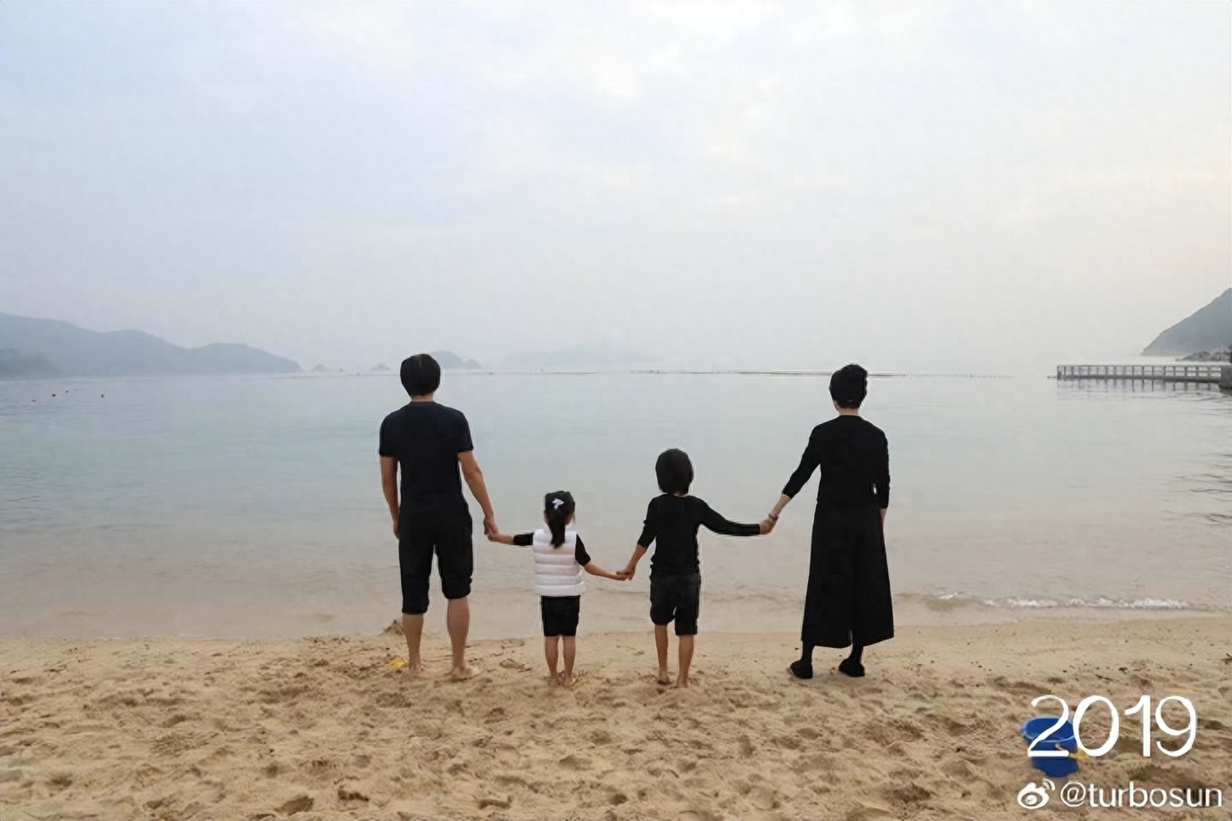 10月6日,长假最后一天,孙俪晒出一家四口在海边的合照。