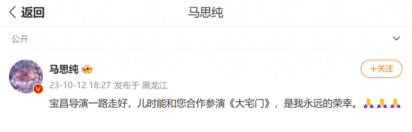 10月12日,曾在儿时参演过《大宅门》的演员马思纯微博发文悼念于11日去世的该剧导演郭宝昌: