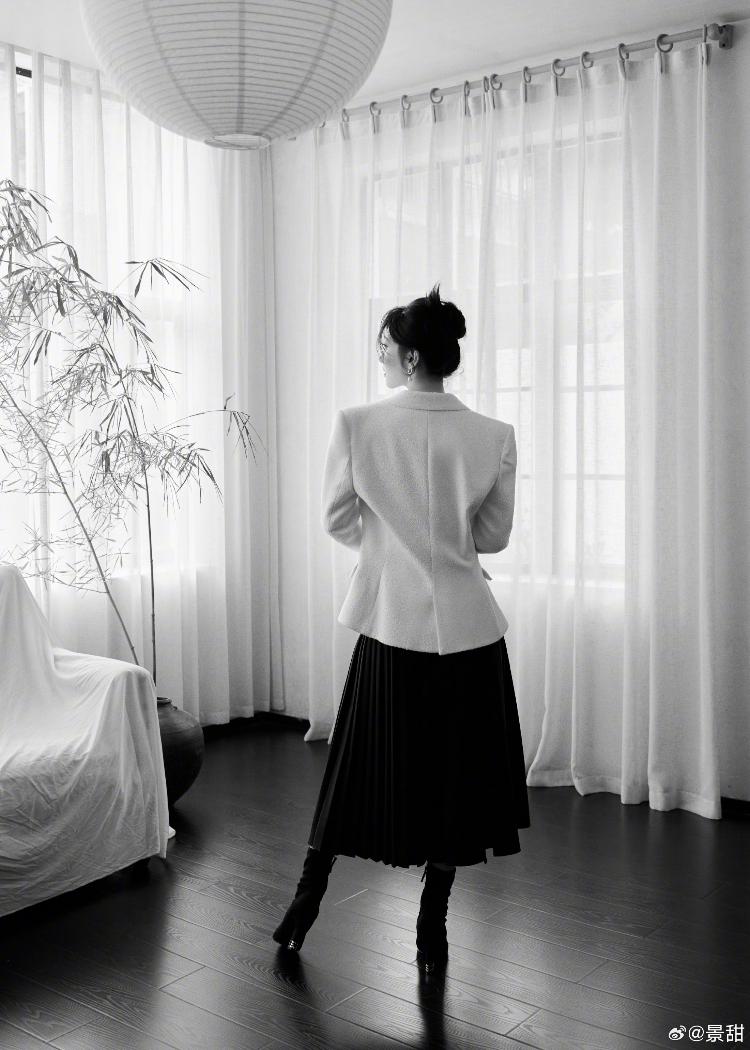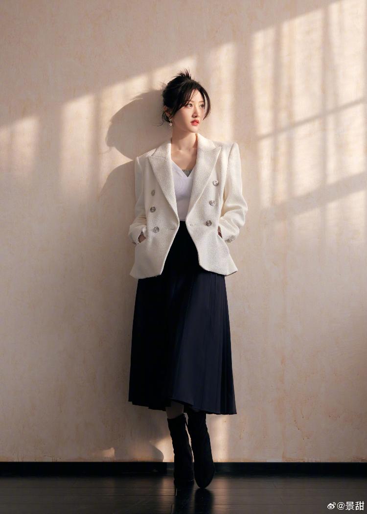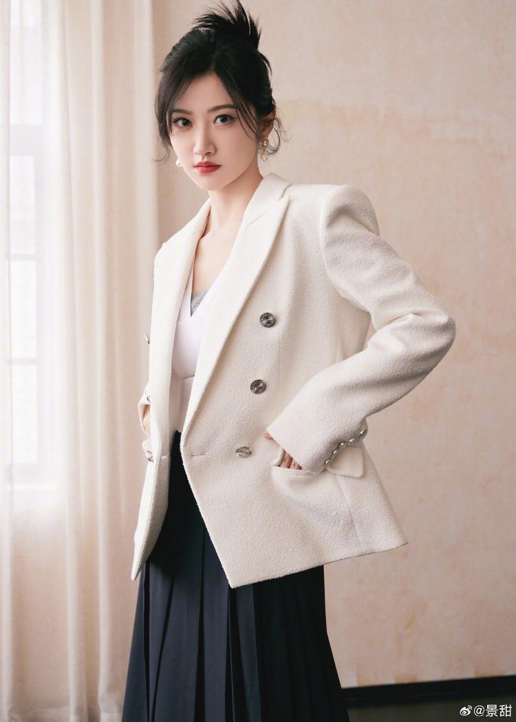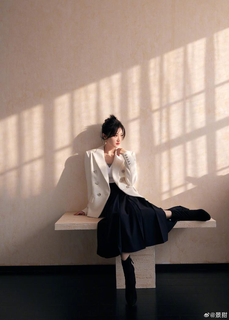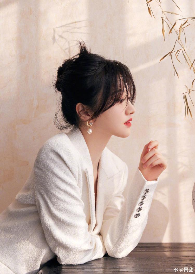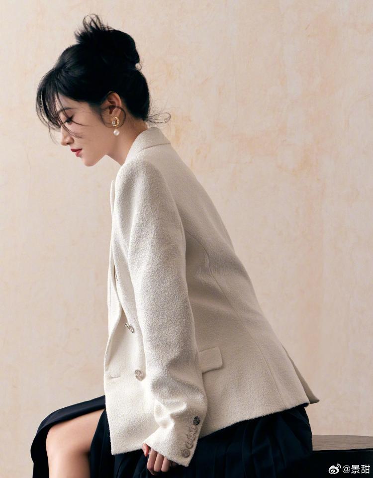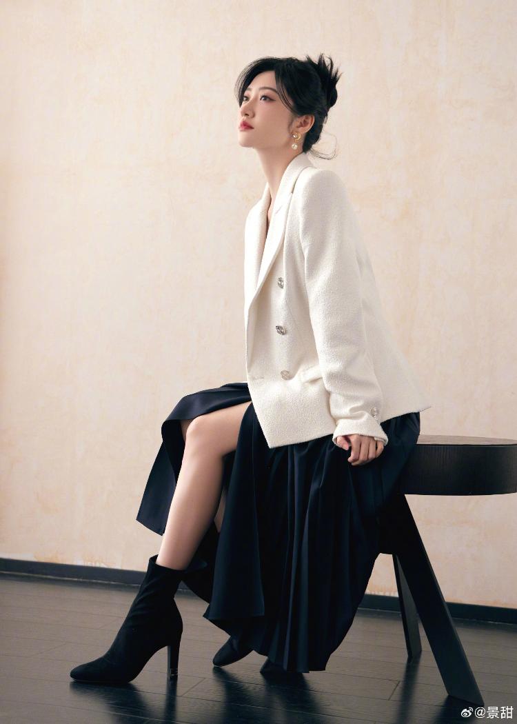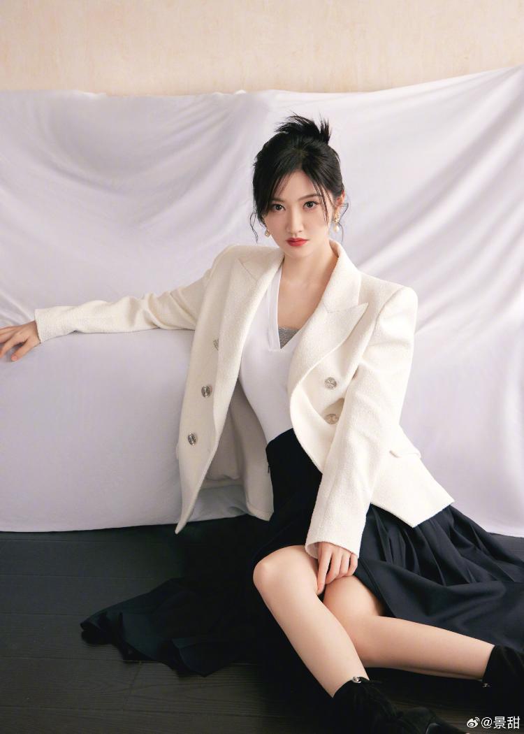 景甜的一组美照曝光,她身穿白色西装外套搭配黑色开衩长裙,露出纤细美腿,盘起长发优雅干练,妆容精致抹红唇气质迷人。