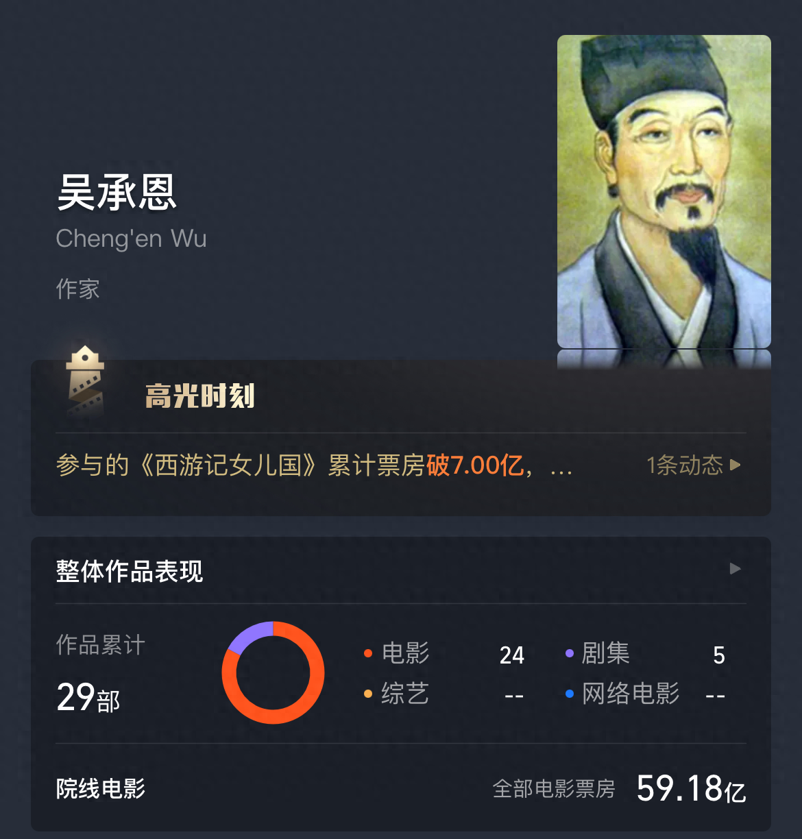 自问世以来,明代文学家吴承恩创作的《西游记》就已通过多种艺术形式,展现出了强大的生命力和影响力。今(1)日,话题“吴承恩作品票房59亿”登上微博热搜,立即引发网友热议。