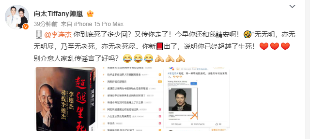 “李连杰,你到底死了多少回?又传你走了!今早你还和我请安啊!”3日上午,好友陈岚发出微博,辟谣李连杰死讯。