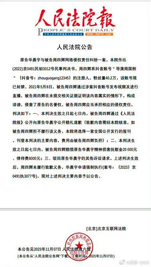 据天眼查App显示,11月7日,北京互联网法院刊登艺人华晨宇与周某某网络侵权责任纠纷民事判决书,华晨宇申请强制执行周某某道歉。