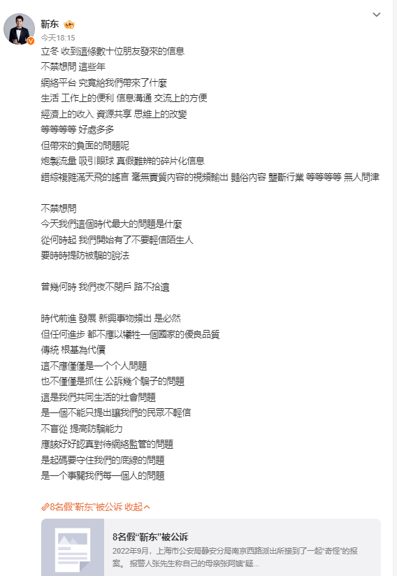 11月8日,演员@靳东发文称收到数十位朋友发来的关于“假靳东事件”的报道信息。他表示,网络平台带来许多负面问题,任何进步都不应以牺牲一个国家的优良品质、传统、根基为代价。这不仅是一个个人问题,是我们共同生活的社会问题,是起码要守住我们的底线的问题,是一个事关我们每一个人的问题。