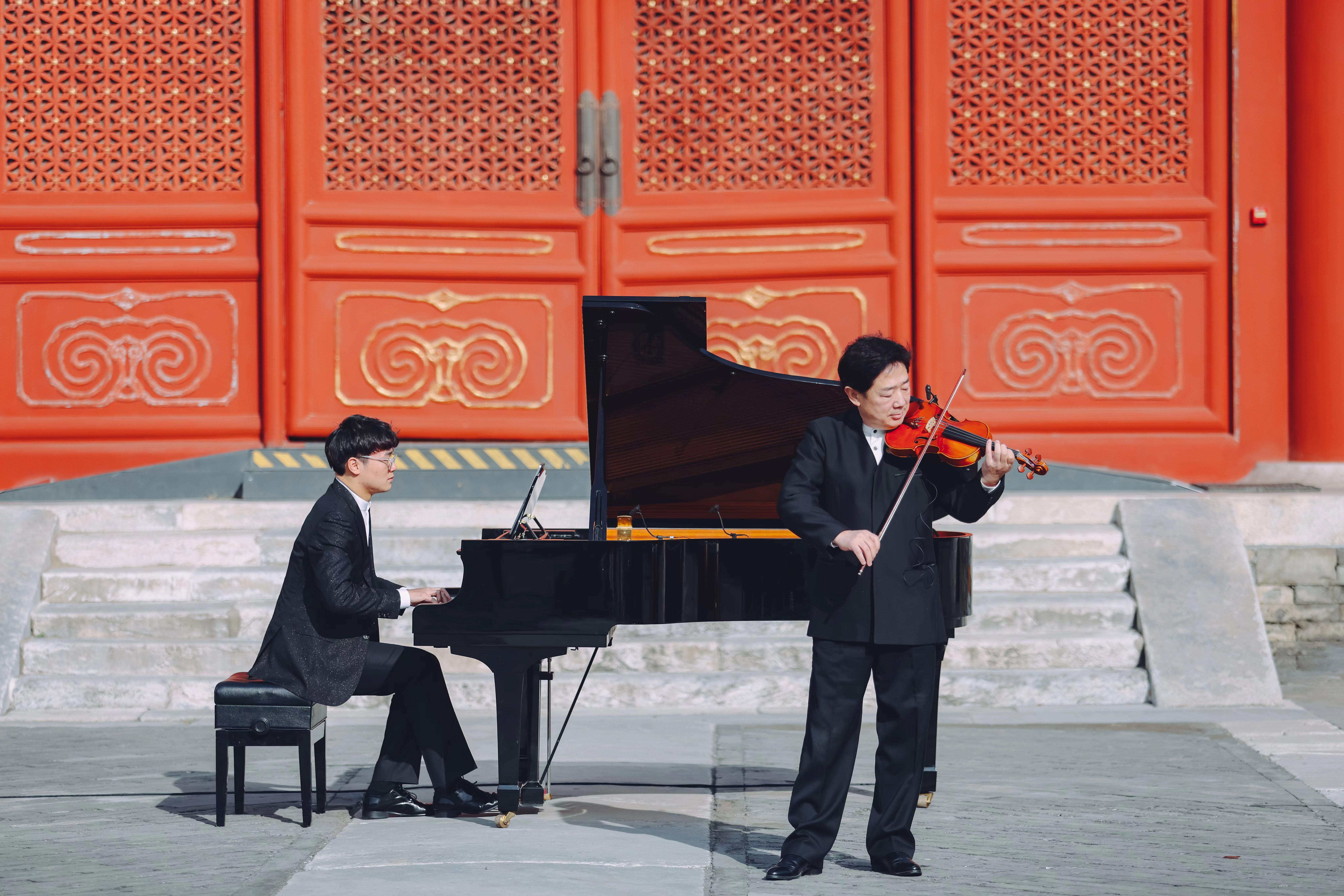 随着小提琴与钢琴合奏的《梁祝》经典片段响起,浪漫哀婉的曲调荡漾在有着600多年历史的先农坛建筑群里。