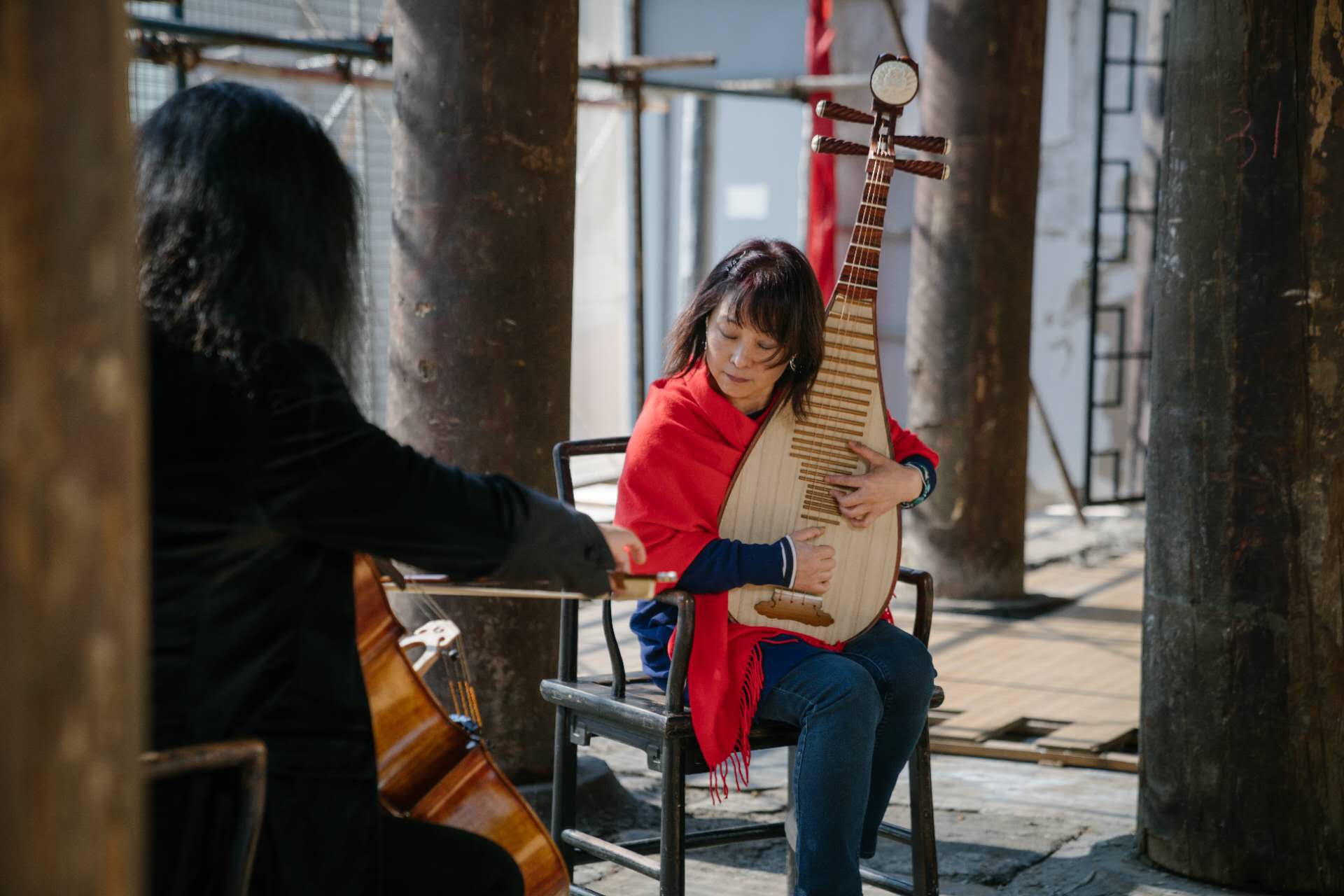 2021年,琵琶演奏家吴蛮与先锋大提琴艺术家宋昭在宏恩观进行演出。图源:北京古建音乐季