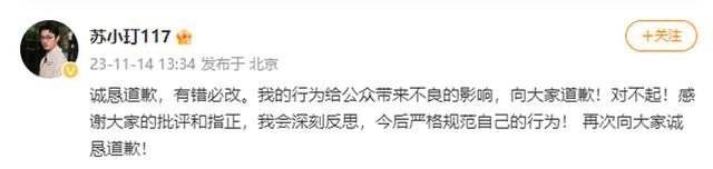 电视剧《狂飙》中高启盛的扮演者苏小玎被曝随地小便,14日,他发微博道歉:“ 诚恳道歉,有错必改。我的行为给公众带来不良的影响,向大家道歉!对不起!感谢大家的批评和指正,我会深刻反思,今后严格规范自己的行为!再次向大家诚恳道歉! ”