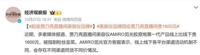 这不是他第一次“翻车”,10月份,据报道,贾乃亮直播间美容仪品牌被指比线下渠道贵1600元。